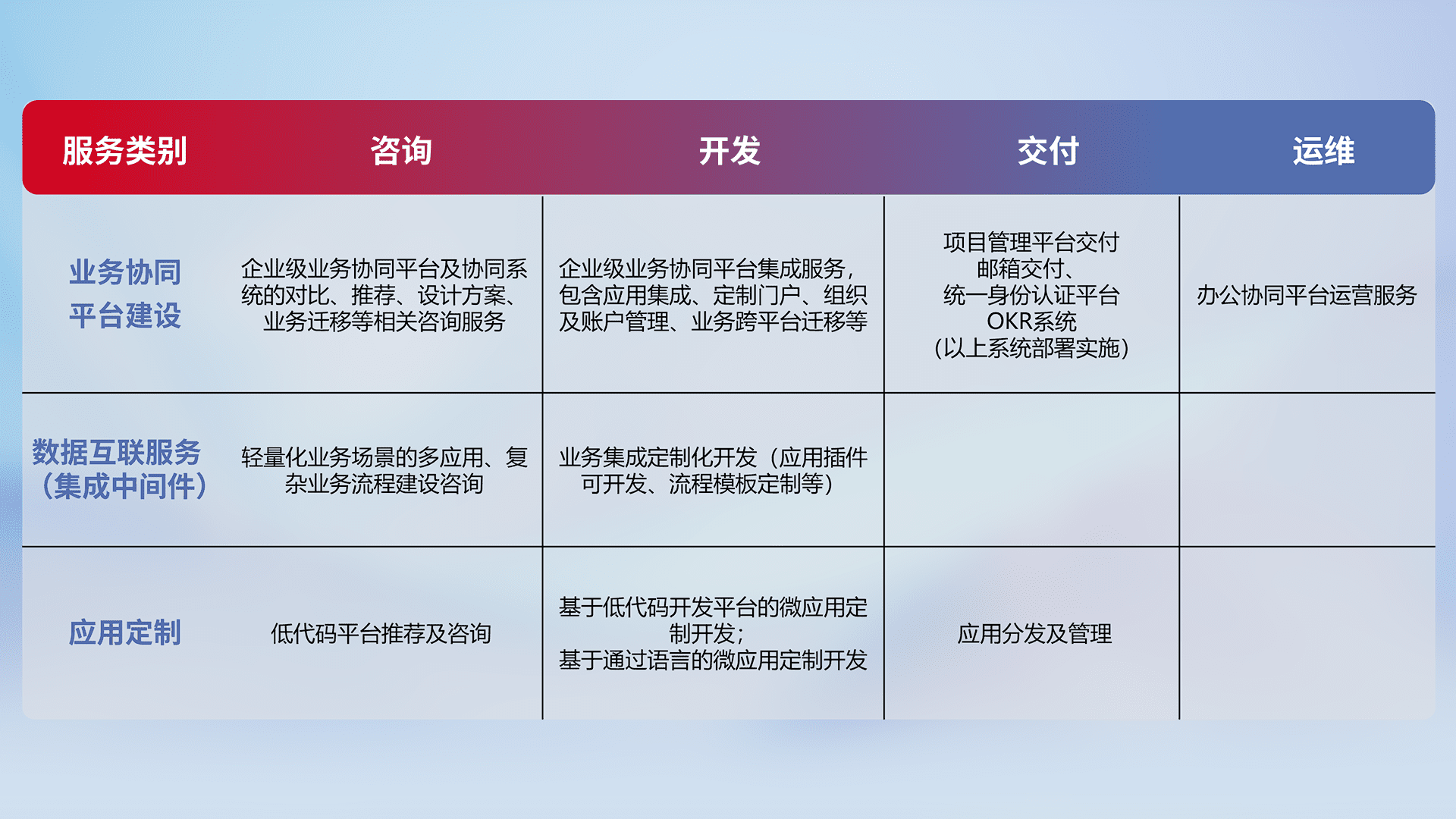 针对钉钉、、、企微、、IDaas等平台级产品提供产品的规划、、方案、、、交付、、、定制化开发等服务,,,实现如统一协同办公、、、、智能客户服务、、、混合会议管理、、智能数据查询、、等业务场景,,实现数字化转型。。。