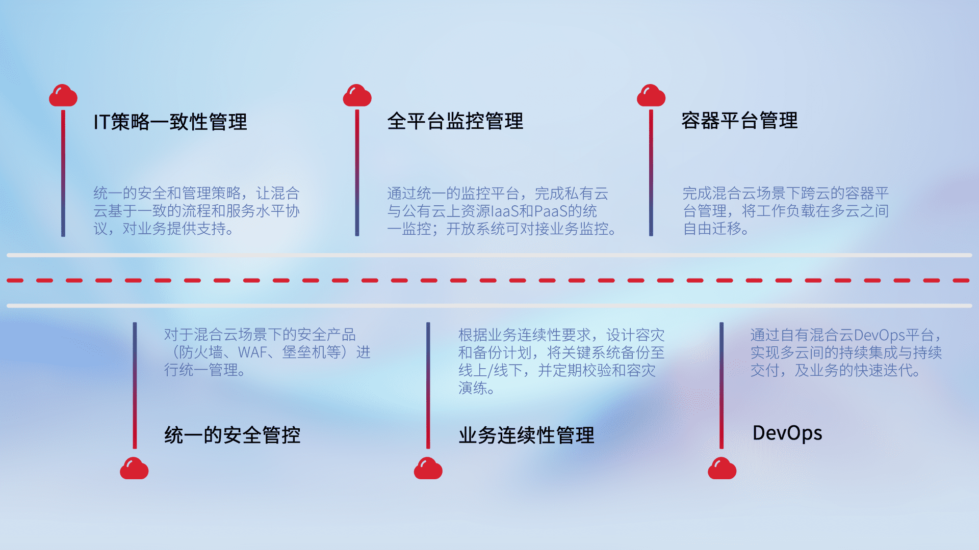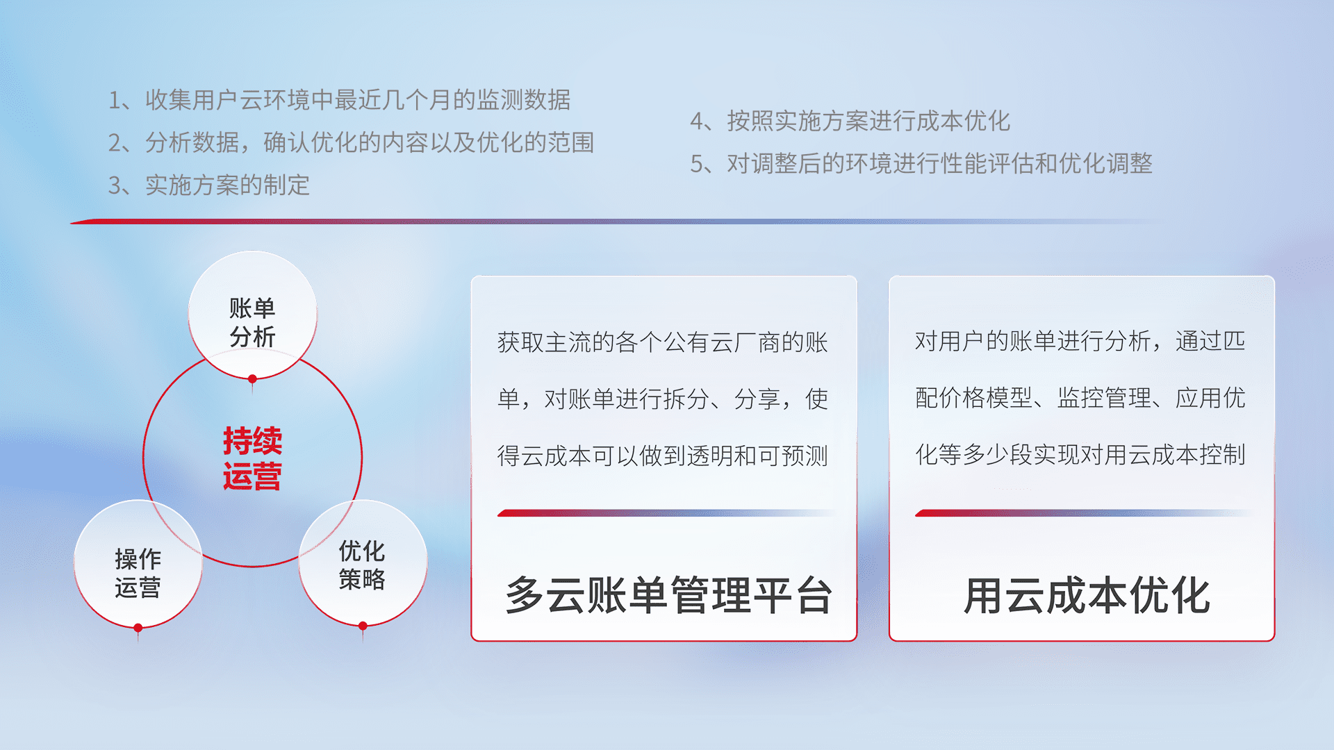 通过多云纳管,,以统一的资源数据模型把客户的云资源进行抽象和封装,,,进而实现对多云资源的统一操作,,,,保障云资源管理的可靠性、、稳定性与可用性。。。量身定制化运维内容,,配置、、、、开发运维、、补丁管理、、、、备份、、、、监控、、认证和访问管理、、、、审计和日常巡检等,,保障在用云过程中的可靠度,,稳定度以及高可用率。。