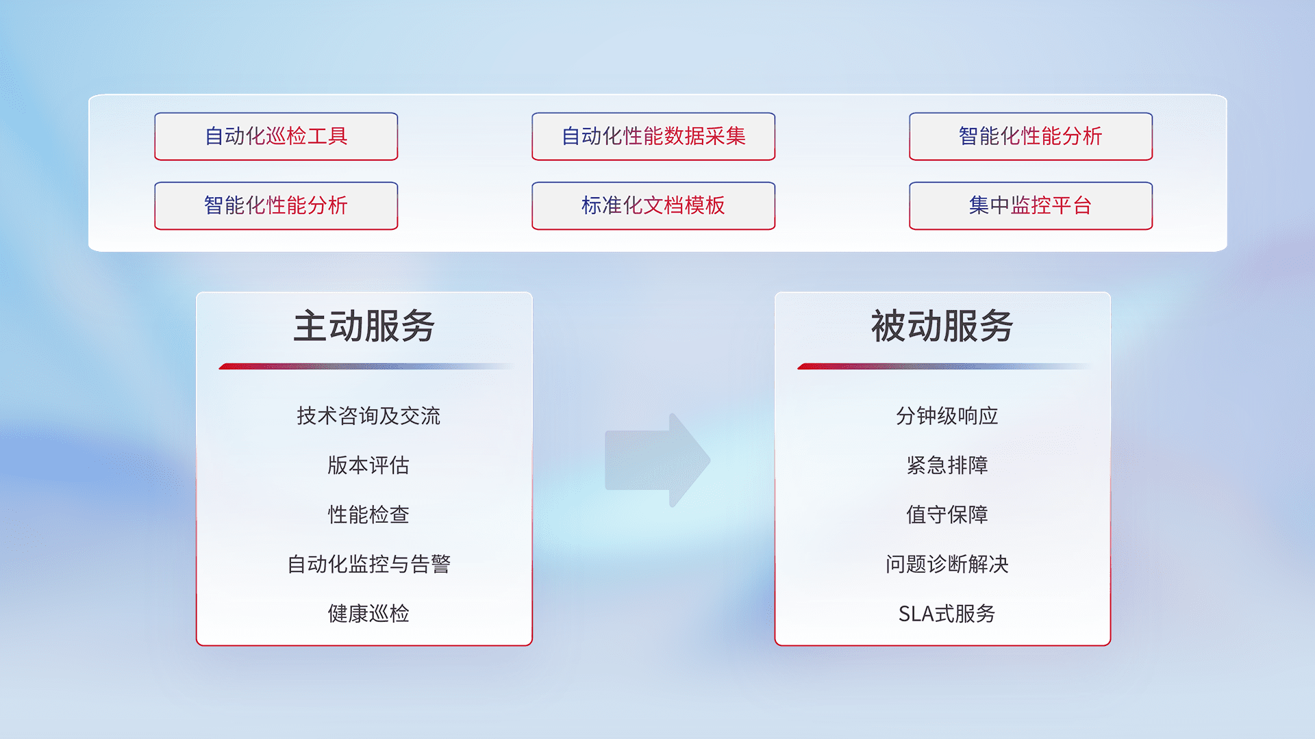 智能化工具和标准化文档,,,保障服务质量,,提供主动服务(包含技术咨询、、、版本评估、、、性能检查、、自动化监控与告警、、、、健康巡检)和被动服务包含(分钟级响应、、紧急排障、、值守保障、、、问题诊断解决、、SLA服务)。。